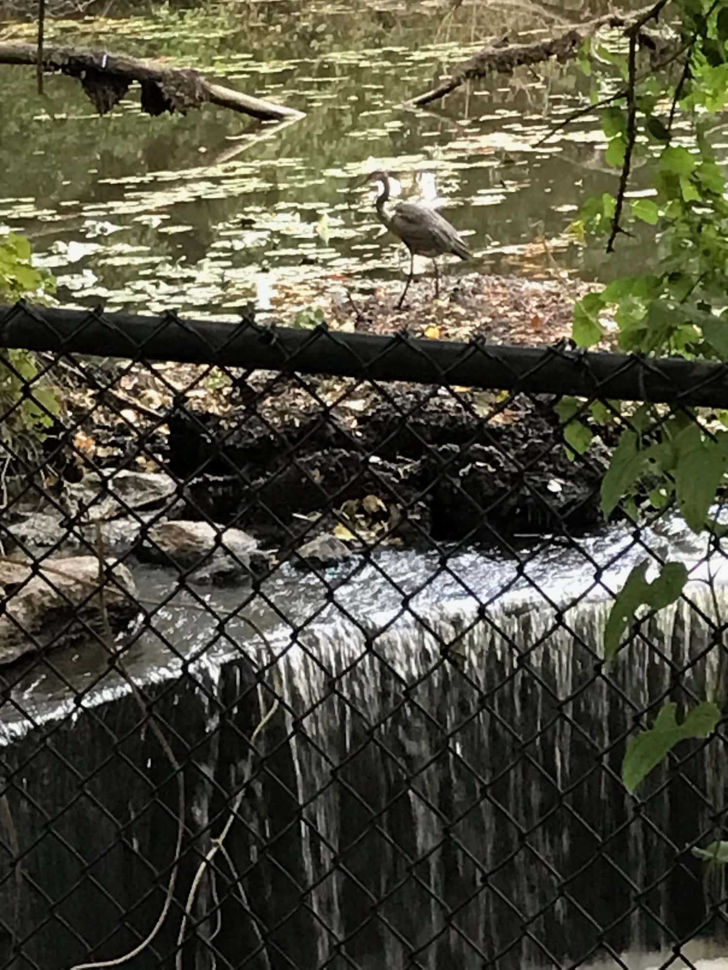 As I was finishing up, a blue heron landed in view near the drain, quietly prowling, looking for dinner.