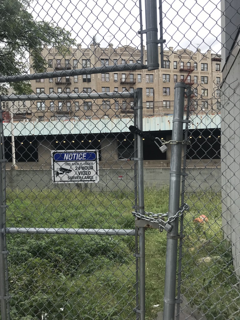 The door remains padlocked, but because of the cut above, a person can easily push the door to create a space to fit through. I did not see that access route right away, it was nicely hidden in plain sight.