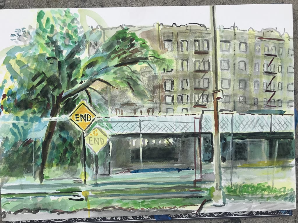 A few cars turn around at the dead end, one awkwardly parks right in front of my easel; the driver watches me for about 15 minutes.